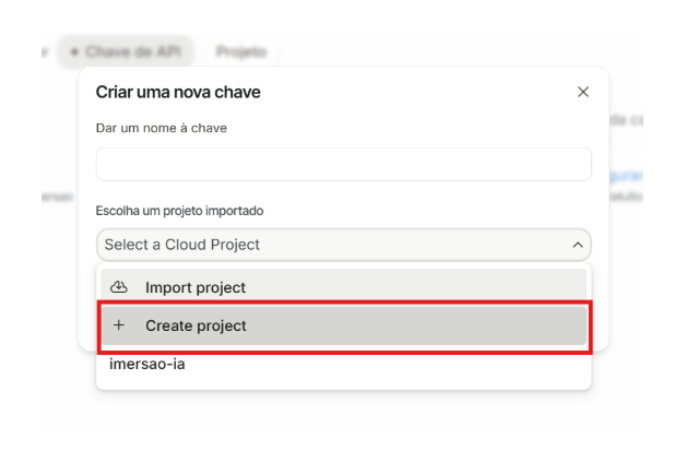 Nessa nova tela, você provavelmente verá um botão como “Create API key in new project” (Criar chave de API em um novo projeto). Clique nele.