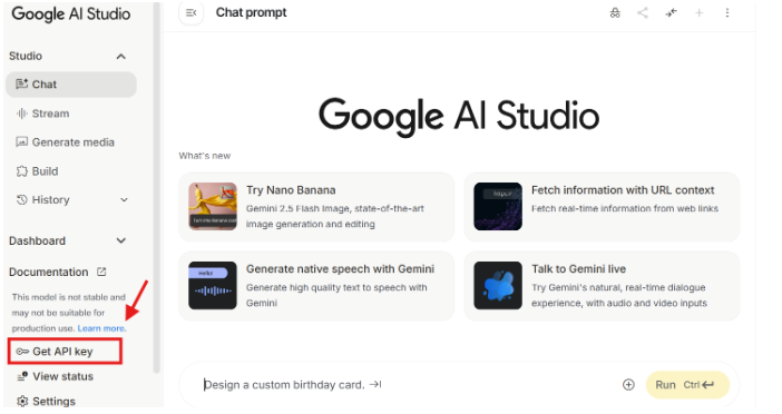 Depois de fazer o login, você estará no ambiente do AI Studio. Agora, vamos encontrar o lugar para criar nossa chave.